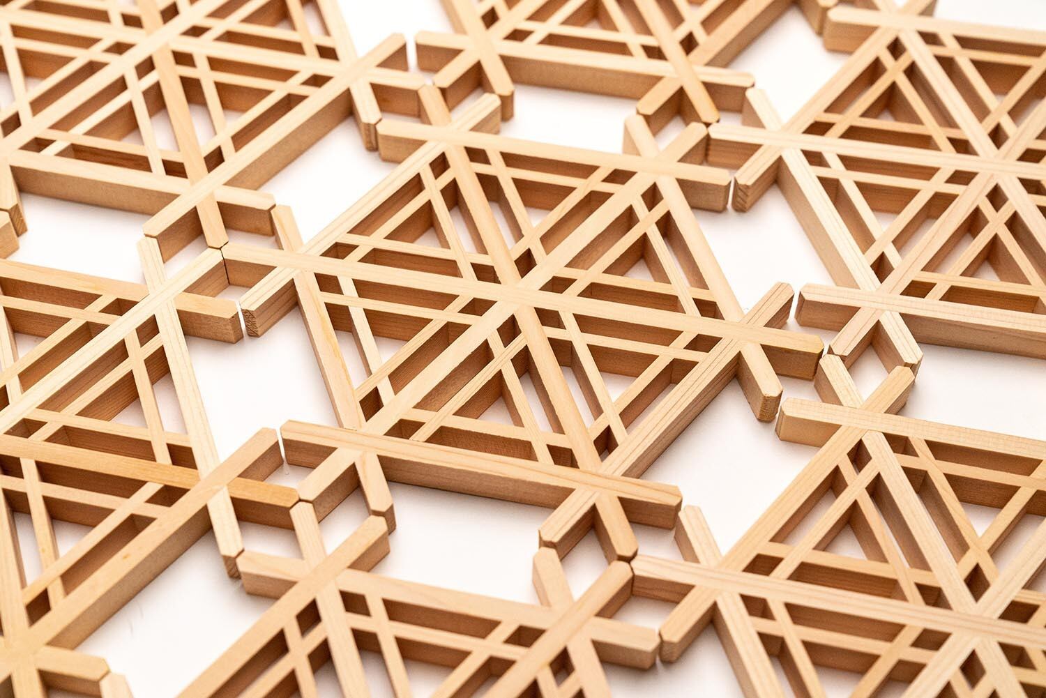 組子は、釘や接着剤 を一切使わずに、木だけで幾何学的な文様を組み上げます。